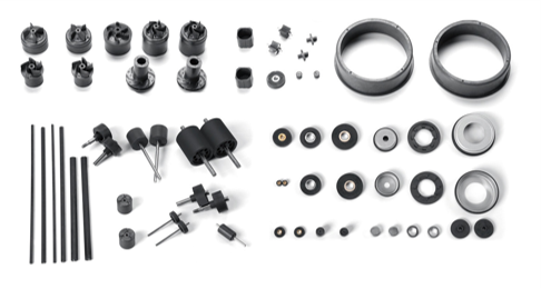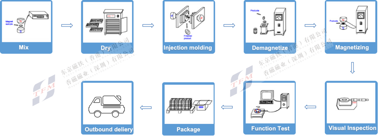 磁性粉末、じゅし(PA 12、PPSなど)、添加剤などの材料を混合し、専用の射出成形機で射出成形により生産された磁石。